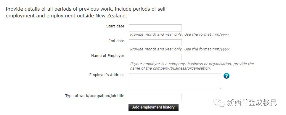 需要注意的是需要提供的工作请款也包含了新西兰境外的所有工作履历,也就是说如果在国内或其他国家工作过,也要提供相关信息,但是信息也很简单,就是起止日期,单位名称地址,职位这些。
