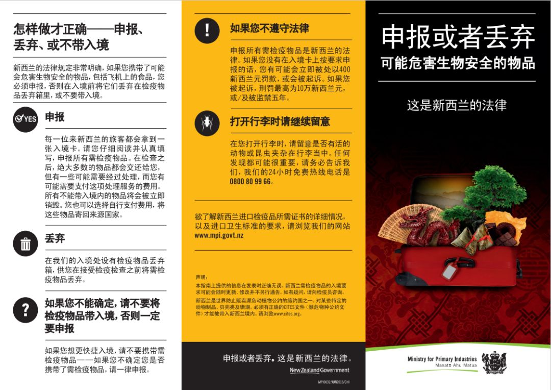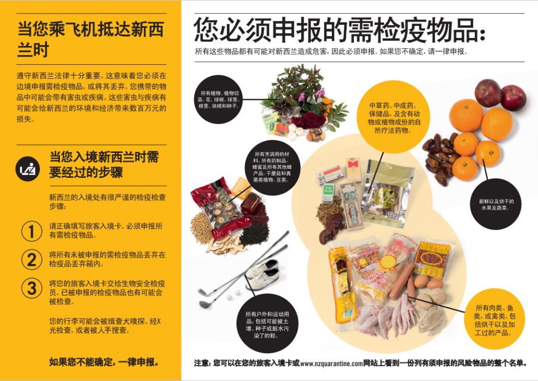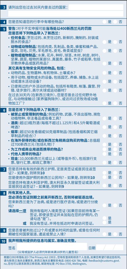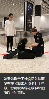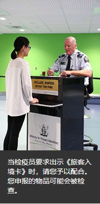 《旅客入境卡》上有关于检疫的问题,您必须在《旅客入境卡》上按要求如实申报携带入境的物品,以便我们检查这些物品是否对新西兰构成危害。如被发现携有未申报的检疫品,您将面临$400纽币的罚金甚至更严厉的惩罚。如果您携带的物品在《旅客入境卡》的列表中,请您主动申报。”
